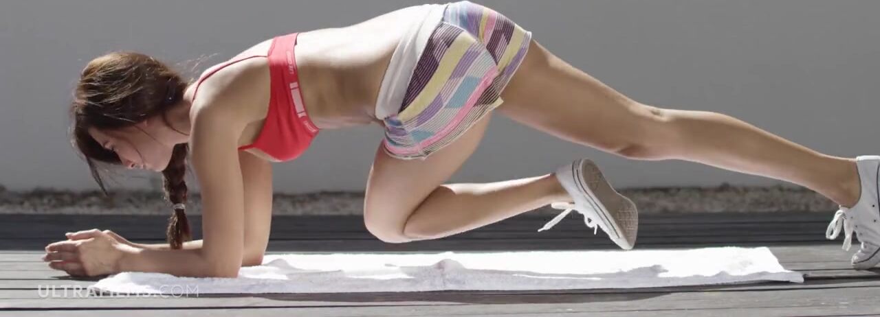 Pretty Michaela Isizzu gets horny while doing some exercises in the backyard