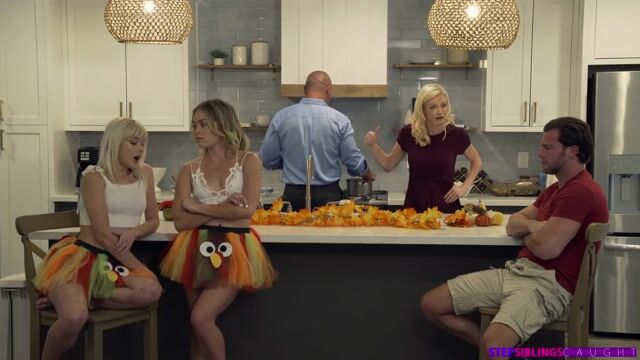 It's Thanksgiving time and Katie Kush and her stepbrother Seth Gamble are ready to celebrate with their parents, Andres Mclovin and Serene Siren. Katie has even been allowed to invite her friend, Jessie Saint, for dinner. The girls are dressed in their holiday costumes for school. Serene asks Seth to put on his costume. He refuses, so Serene tells him to stuff the turkey instead. Seth claims he doesn't know how, so Serene kicks all three kids out of the kitchen and tells them to come back in an hour with the knowledge of what to do. Relocating to the bedroom, Seth pulls up online videos while Jessie offers to just show him how to do it. Seth is a jerk, so the girls make a plan to fuck with him.Undressing Jessie, Katie lays her out on the bed so that she's nice and naked and ready for Seth to stuff her. Jessie tells Seth that first he needs to take the giblets out. He can practice by finger banging her. The girls tell Seth that next he needs something to stuff in. They point out that Seth's dick is already hard so he can use that. It takes a second to convince Seth that this is the right call, but Katie helps Seth whip it out and shove it into Jessie's snatch. At first, Katie is only trying to get her friend laid. As Seth keeps pounding Jessie right, though, Katie decides she wants some of that D for herself.Getting on her knees on the bed, Katie moans in delight as Seth stuffs her, too. She leans forward and eats Jessie out as she's getting fucked, making sure that Jessie's good times keep rolling. Next Seth lays on the bed so Jessie can climb on top and ride his dick in reverse cowgirl. Katie gets another shot at the D when she takes Jessie's place and rides Seth. Her position lets her once again lean forward to eat her friend out even as her hips set an orgasmic rhythm. Finally sated, the girls work together to blow Seth until he delivers a cumshot that they can both enjoy together.